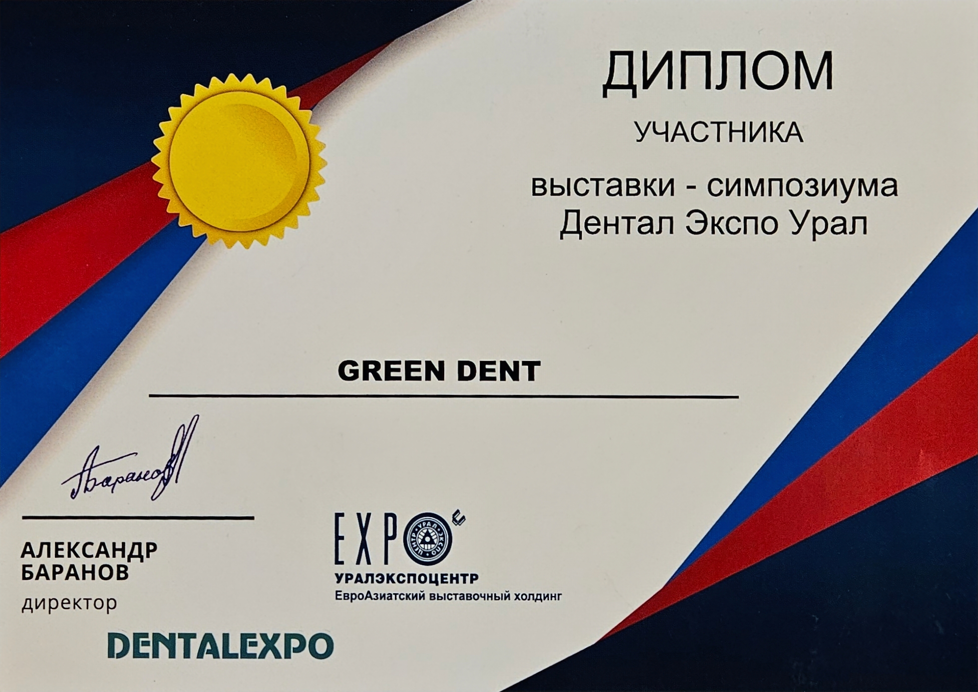 Организаторы настоящим удостоверяют, что компания GREEN DENT являлась участником международной выставки «Дентал-Экспо Санкт-Петербург»