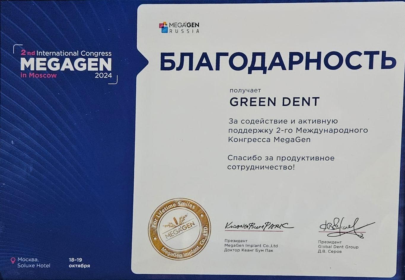 Благодарность компании GREEN DENT за поддержку и плодотворное сотрудничество